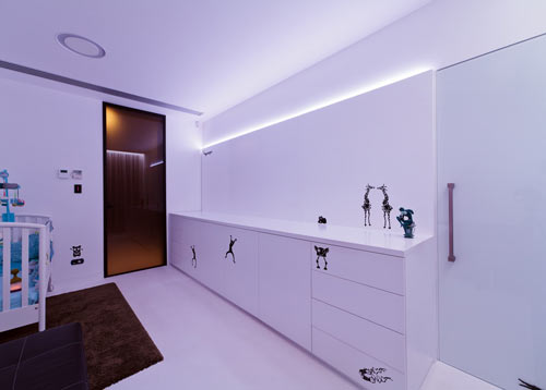 The majority of the interior design of the apartment is designed with about three main colors – white, black and brownish, however the addition of colored illumination creates virtually any kind of feeling you want…