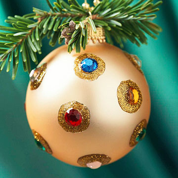 Dressed up in jewels for the holidays, these quick-to-make ornaments will be the star attraction of your Christmas tree. The ornaments are crafted using a purchased ball ornament, crafts-store beads, and gold glitter.